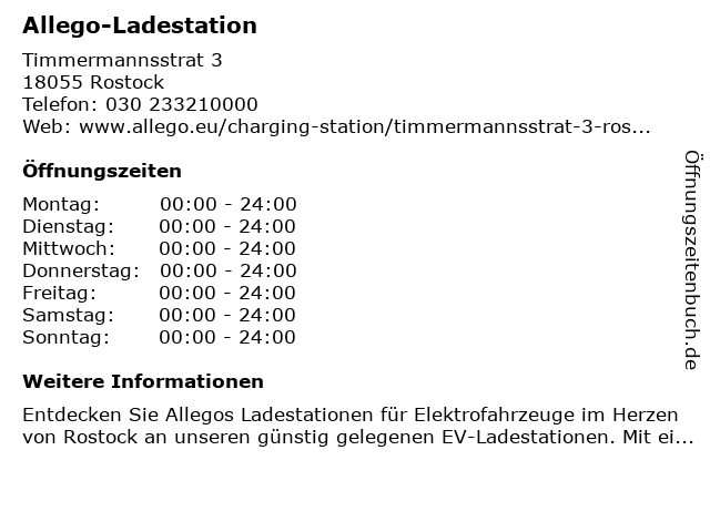 | Öffnungszeiten Allego-Ladestation in Rostock anzeigen | |