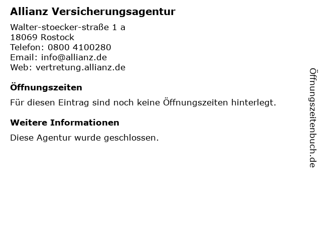 | Öffnungszeiten Allianz Versicherungsagentur in Rostock anzeigen | |