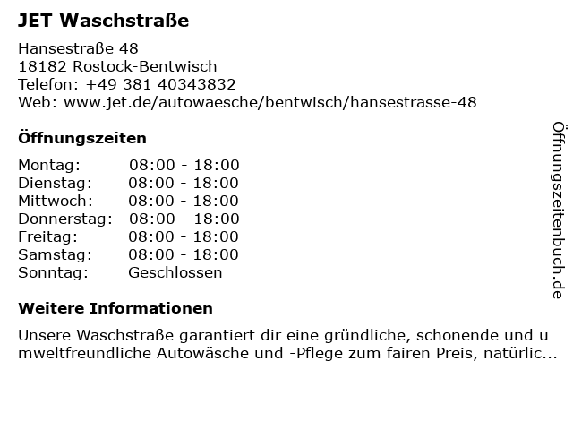 Öffnungszeiten JET Waschstraße in Rostock-Bentwisch anzeigen | |