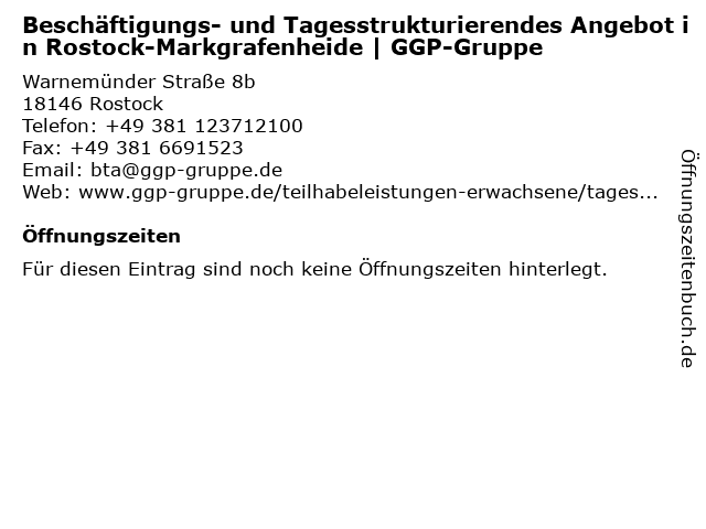 | Beschäftigungs- und Tagesstrukturierendes Angebot in Rostock-Markgrafenheide | GGP-Gruppe anrufen | |