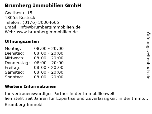 | Öffnungszeiten Brumberg Immobilien GmbH in Rostock anzeigen | |