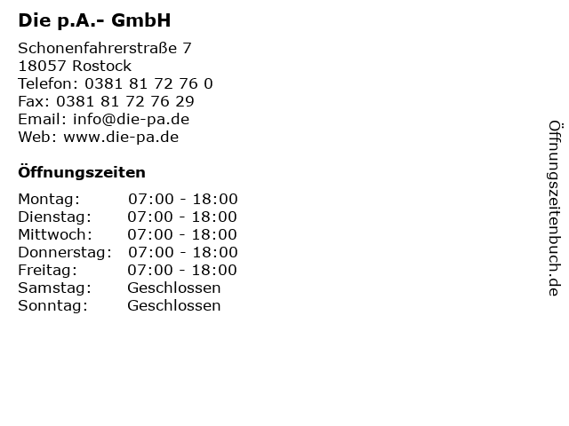 | Öffnungszeiten Die p.A.- GmbH in Rostock anzeigen | |