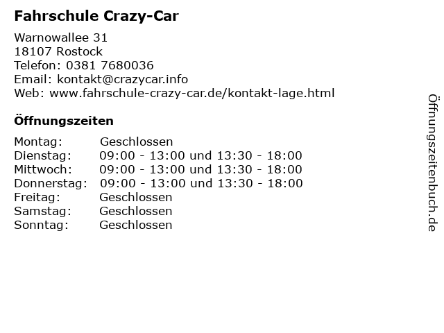 | Öffnungszeiten Fahrschule Crazy-Car in Rostock anzeigen | |
