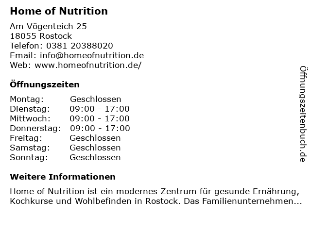 | Öffnungszeiten Home of Nutrition in Rostock anzeigen | |
