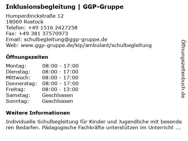 1 Kita-Flex und Kindertagesstätte Humperdinckstraße | GGP-Gruppe (Entfernung: 0,00 km) Humperdinckstraße 12, 18069 Rostock 2 5 Kindertagesstätte Waldemarstr. 33 | GGP-Gruppe (Entfernung: 1,37 km) Waldemarstraße 33, 18057 Rostock 6 |