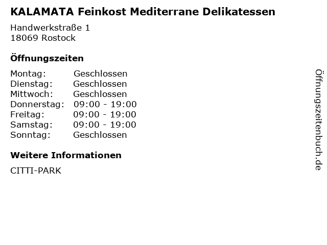 | Öffnungszeiten KALAMATA Feinkost Mediterrane Delikatessen in Rostock anzeigen | |