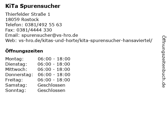 | Öffnungszeiten KiTa Spurensucher in Rostock anzeigen | |