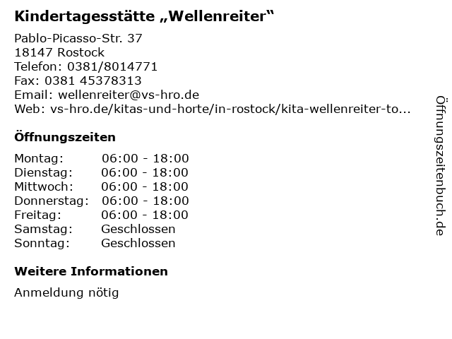 Öffnungszeiten Kindertagesstätte „Wellenreiter“ in Rostock anzeigen