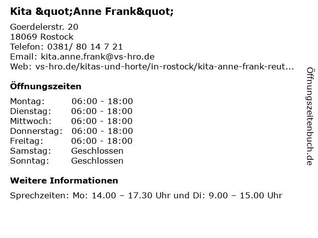 Öffnungszeiten Kita "Anne Frank" in Rostock anzeigen | |