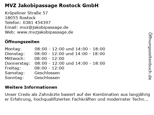 Branchen & Suchbegriffe zu MVZ Jakobipassage Rostock GmbH:dentalhygieniker, jakobipassage, kieferorthopädie, kinderzahnheilkunde, kosmetische zahnbehandlung, mvz, parodontologie für zahnimplantate |