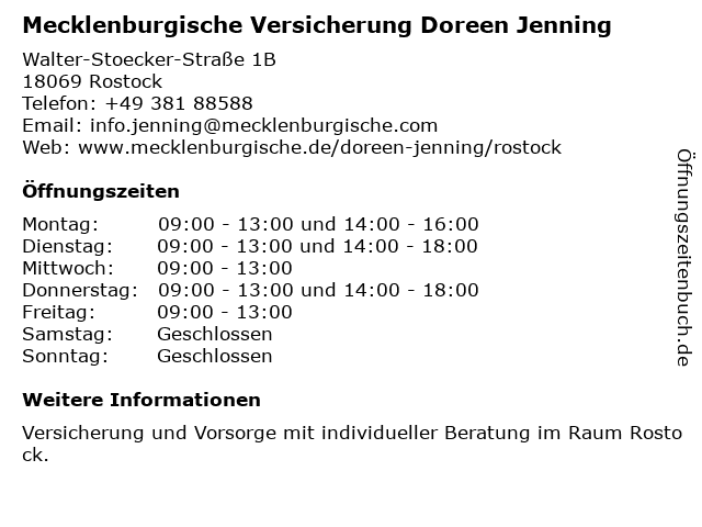 1 Mecklenburgische Versicherung Peter-Michael Schmidt (Entfernung: 0,03 km) Walter-Stoecker-Straße 1A, 18069 Rostock 3 Mecklenburgische Versicherungsgruppe Carl-Robert Kayalz Vermittlung von Versicherungen (Entfernung: 4,02 km) Goetheplatz 1, 18055 Rostock 4 Mecklenburgische Versicherungsgruppe - Carl-Robert Kayatz & Martin Hamann (Entfernung: 4,03 km) Goetheplatz 1, 18055 Rostock 5 Kinderbetreuungseinrichtung Kindertagespflegestelle Doreen Bull (Entfernung: 4,32 km) Am Schmarler Bach 2, 18106 Rostock 6 |