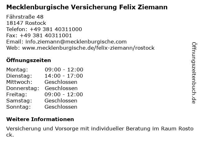 4 Mecklenburgische Versicherung Christian Sattler - Versicherungsagentur (Entfernung: 2,19 km) Am Strande 3A, 18055 Rostock 5 Mecklenburgische Versicherungsgruppe Carl-Robert Kayalz Vermittlung von Versicherungen (Entfernung: 2,50 km) Goetheplatz 1, 18055 Rostock 6 Mecklenburgische Versicherungsgruppe - Carl-Robert Kayatz & Martin Hamann (Entfernung: 2,51 km) Goetheplatz 1, 18055 Rostock |