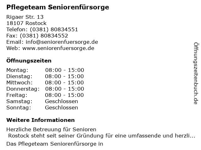| Öffnungszeiten Pflegeteam Seniorenfürsorge in Rostock anzeigen | |