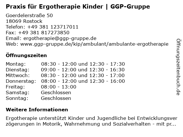 2 Praxis für Kinder- und Jugendpsychiatrie | GGP-Gruppe (Entfernung: 0,00 km) Goerdelerstraße 50, 18069 Rostock 3 Psychiatrischer Fachpflegedienst | GGP-Gruppe (Entfernung: 0,00 km) Goerdelerstraße 50, 18069 Rostock 4 Medizinisches Versorgungszentrum Goerdelerstraße | GGP-Gruppe (Entfernung: 0,00 km) Goerdelerstraße 50, 18069 Rostock 6 |
