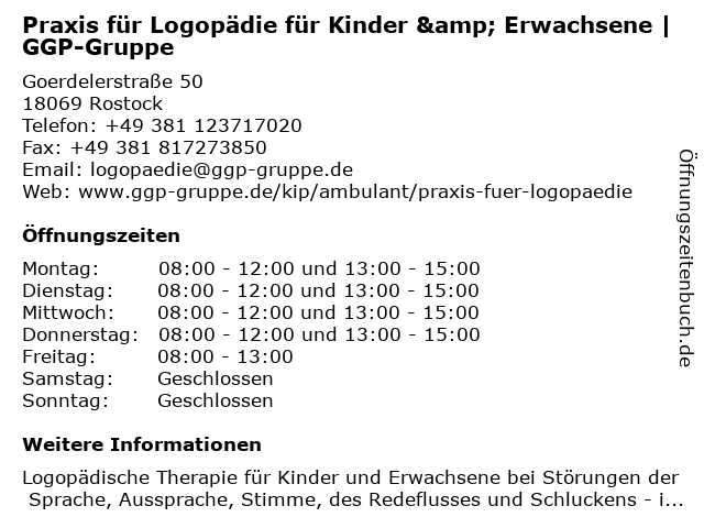 Branchen & Suchbegriffe zu Praxis für Logopädie für Kinder & Erwachsene | GGP-Gruppe:erwachsene, ggp, gruppe, kinder, logopädie, logopädie rostock, praxis, praxis für logopädie, redeflussstörungen, schlucktherapie, sprachentwicklungsstörungen, sprachtherapie, sprechtherapie, stimmtherapie |
