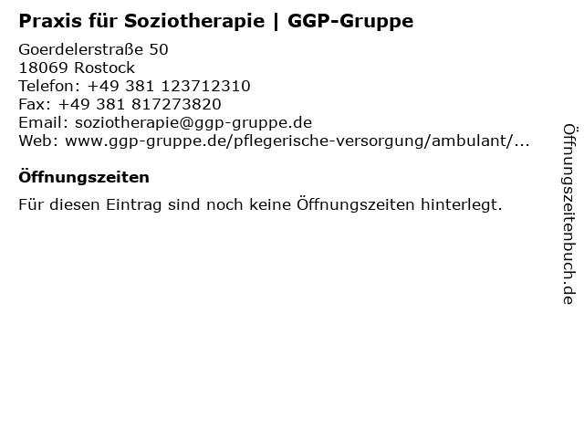 2 Praxis für Kinder- und Jugendpsychiatrie | GGP-Gruppe (Entfernung: 0,00 km) Goerdelerstraße 50, 18069 Rostock 3 Psychiatrischer Fachpflegedienst | GGP-Gruppe (Entfernung: 0,00 km) Goerdelerstraße 50, 18069 Rostock 4 Medizinisches Versorgungszentrum Goerdelerstraße | GGP-Gruppe (Entfernung: 0,00 km) Goerdelerstraße 50, 18069 Rostock 6 |