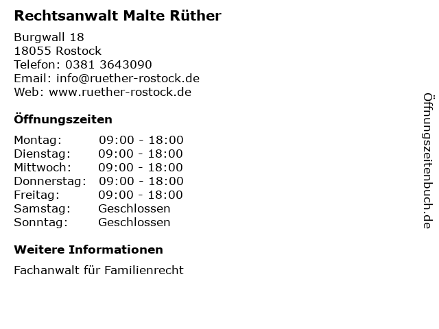 | Öffnungszeiten Rechtsanwalt Malte Rüther in Rostock anzeigen | |
