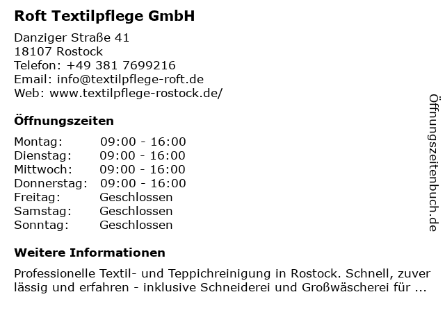 | Öffnungszeiten Roft Textilpflege GmbH in Rostock anzeigen | |