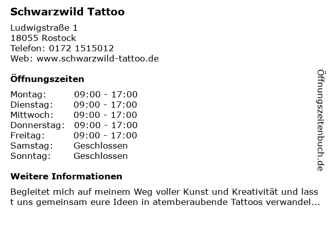 | Öffnungszeiten Schwarzwild Tattoo in Rostock anzeigen | |