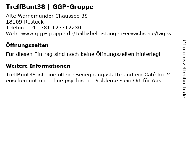 | Öffnungszeiten TreffBunt38 | GGP-Gruppe in Rostock anzeigen | |