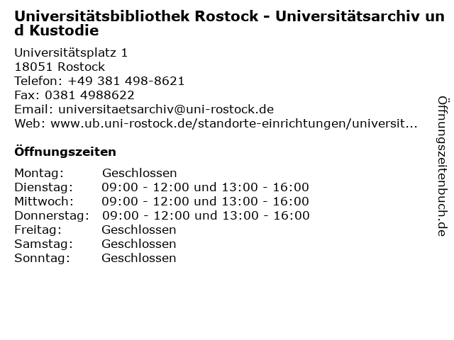 Branchen & Suchbegriffe zu Universitätsbibliothek Rostock - Universitätsarchiv und Kustodie:akten, archiv, dokumente, kustodie, sammlung, universitätsarchiv, universitätsbibliothek, unterlagen |