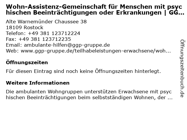 | Wohn-Assistenz-Gemeinschaft für Menschen mit psychischen Beeinträchtigungen oder Erkrankungen | GGP-Gruppe anrufen | |