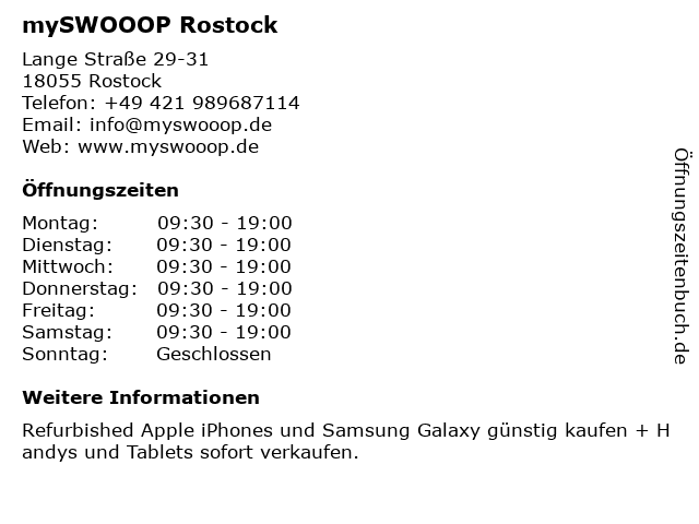 | Öffnungszeiten mySWOOOP Rostock in Rostock anzeigen | |