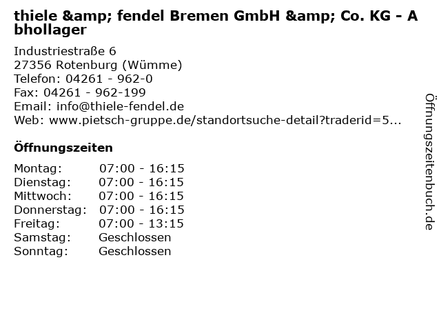 1 thiele & fendel Bremen GmbH & Co. KG - Verkauf (Entfernung: 0,00 km) Industriestraße 6, 27356 Rotenburg (Wümme) 2 badpunkt Badaustellung - thiele & fendel Bremen GmbH & Co. KG (Entfernung: 0,00 km) Industriestraße 6, 27356 Rotenburg 5 thiele & fendel Bremen GmbH & Co. KG - Abhollager (Entfernung: 38,20 km) Dölvesstraße 8, 28207 Bremen 6 badpunkt Badaustellung - thiele & fendel Bremen GmbH & Co. KG (Entfernung: 44,07 km) Duckwitzstraße 86, 28199 Bremen |