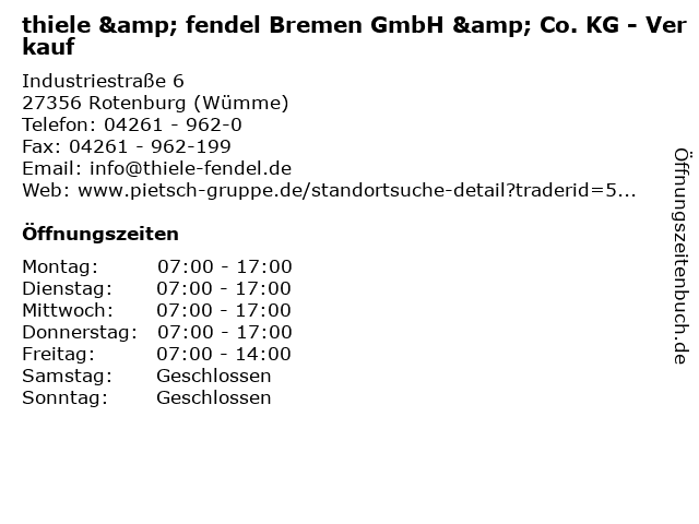 1 thiele & fendel Bremen GmbH & Co. KG - Abhollager (Entfernung: 0,00 km) Industriestraße 6, 27356 Rotenburg (Wümme) 2 badpunkt Badaustellung - thiele & fendel Bremen GmbH & Co. KG (Entfernung: 0,00 km) Industriestraße 6, 27356 Rotenburg 5 thiele & fendel Bremen GmbH & Co. KG - Abhollager (Entfernung: 38,20 km) Dölvesstraße 8, 28207 Bremen 6 badpunkt Badaustellung - thiele & fendel Bremen GmbH & Co. KG (Entfernung: 44,07 km) Duckwitzstraße 86, 28199 Bremen |