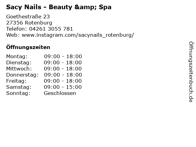 | Öffnungszeiten Sacy Nails - Beauty & Spa in Rotenburg anzeigen | |