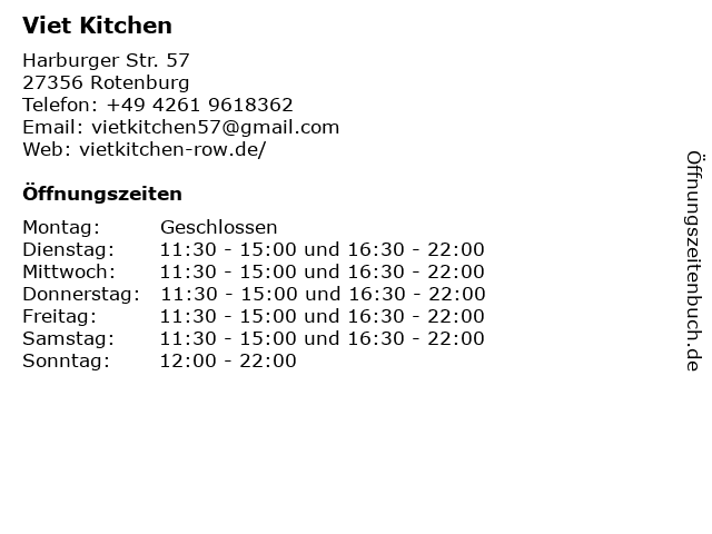 | Öffnungszeiten Viet Kitchen in Rotenburg anzeigen | |