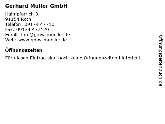 | Öffnungszeiten Gerhard Müller GmbH in Roth anzeigen | |