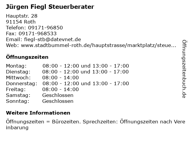| Öffnungszeiten Jürgen Fiegl Steuerberater in Roth anzeigen | |