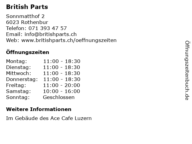 | Öffnungszeiten British Parts in Rothenbur anzeigen | |