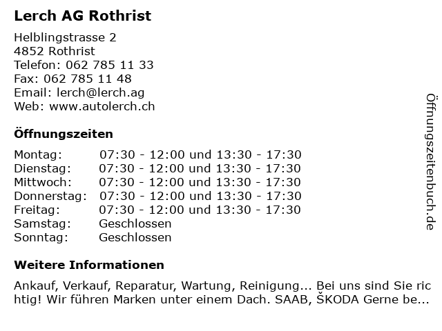 | Öffnungszeiten Lerch AG Rothrist in Rothrist anzeigen | |