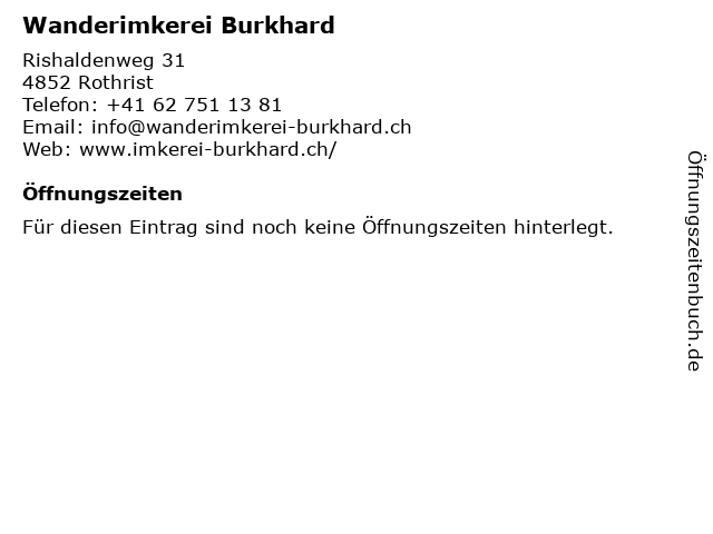 | Öffnungszeiten Wanderimkerei Burkhard in Rothrist anzeigen | |