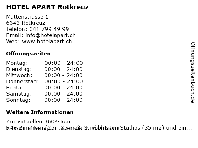 | Öffnungszeiten HOTEL APART Rotkreuz in Rotkreuz anzeigen | |