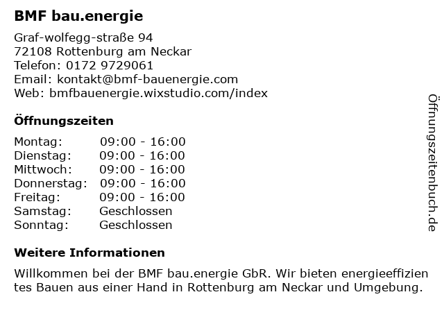 | Öffnungszeiten BMF bau.energie in Rottenburg am Neckar anzeigen | |