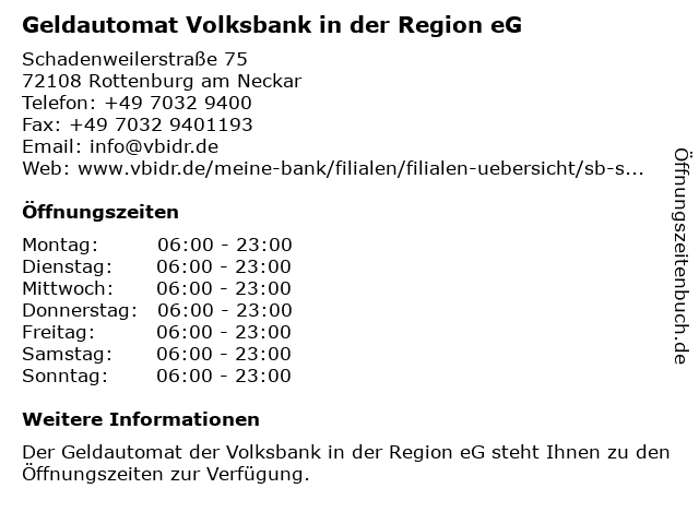 2 Geldautomat Volksbank in der Region eG (Entfernung: 1,69 km) Schuhstraße 74, 72108 Rottenburg am Neckar 3 Geldautomat Volksbank in der Region eG (Entfernung: 8,40 km) Hadolfinger Straße 8, 72108 Rottenburg-Hailfingen 6 Geldautomat Volksbank in der Region eG (Entfernung: 12,46 km) Öschelbronner Straße 2, 71126 Gäufelden |
