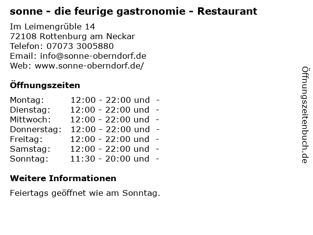 | Sonntag | 11:30-20:00 |