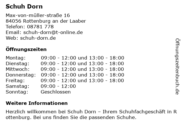 | Öffnungszeiten Schuh Dorn in Rottenburg an der Laaber anzeigen | |