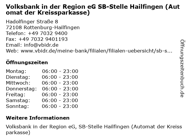 3 Volksbank Herrenberg·Nagold·Rottenburg eG - (SB-Stelle Hailfingen) (Entfernung: 0,04 km) Hadolfinger Str. 20, 72108 Rottenburg/Neckar 4 Volksbank in der Region eG SB-Stelle Seebronn (Automat der Kreissparkasse) (Entfernung: 2,33 km) Seegasse 1, 72108 Rottenburg am Neckar 5 Volksbank in der Region eG, Filiale Gültstein (Entfernung: 5,33 km) Altinger Straße 2, 71083 Herrenberg 6 Volksbank in der Region eG, Filiale Gültstein (Entfernung: 5,33 km) Altinger Straße 2, 71083 Herrenberg |