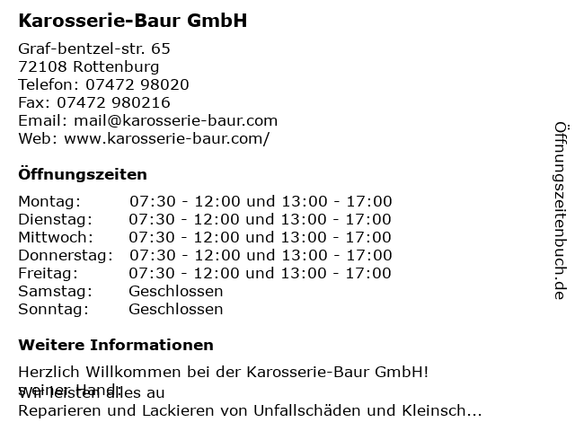 | Öffnungszeiten Karosserie-Baur GmbH in Rottenburg anzeigen | |