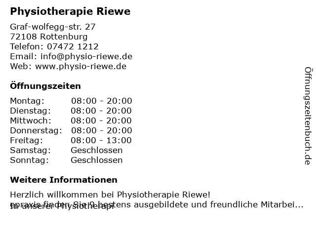 | Öffnungszeiten Physiotherapie Riewe in Rottenburg anzeigen | |