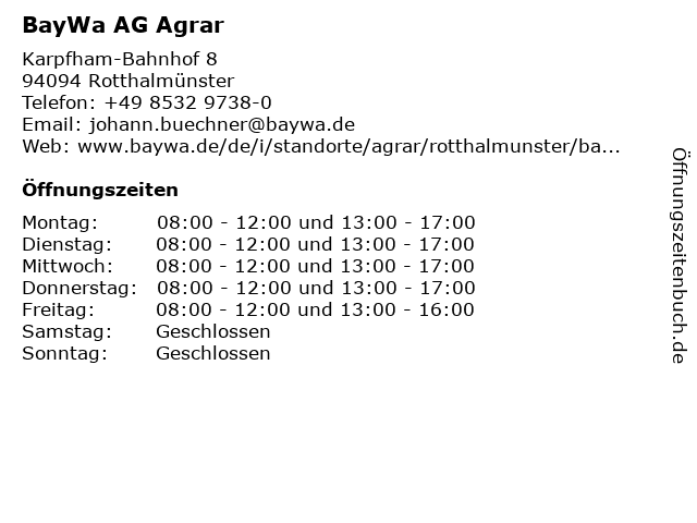 | Öffnungszeiten BayWa AG Agrar in Rotthalmünster anzeigen | |