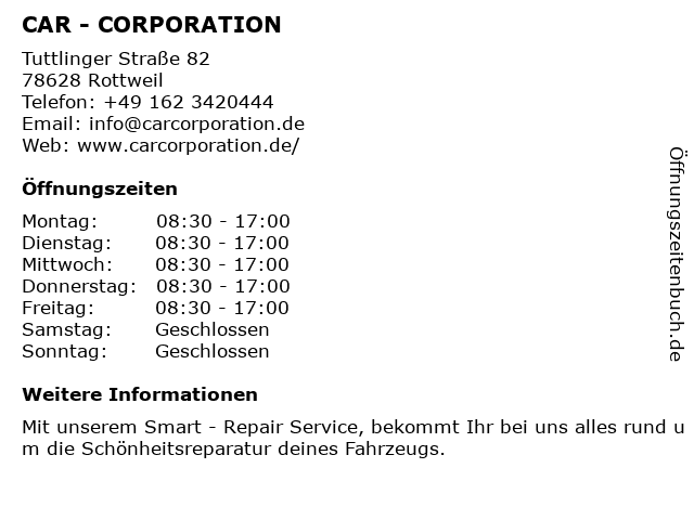 | Öffnungszeiten CAR - CORPORATION in Rottweil anzeigen | |