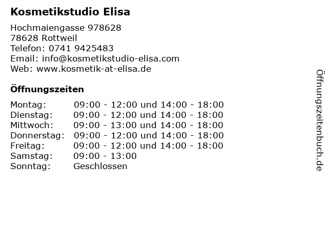 | Öffnungszeiten Kosmetikstudio Elisa in Rottweil anzeigen | |