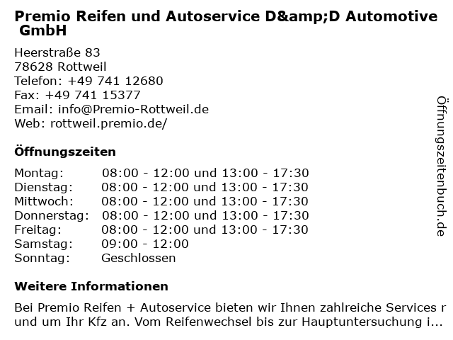 Branchen & Suchbegriffe zu Premio Reifen und Autoservice D&D Automotive GmbH:auto service, automotive, autoservice, autowerkstatt, bremsenservice, d&d, premio, reifen, reifen kaufen, reifen service, reifenhändler, sommerreifen, winterreifen |