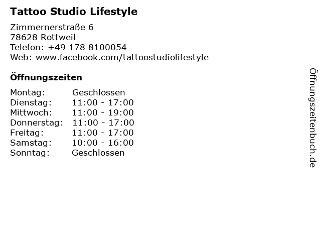 | Öffnungszeiten Tattoo Studio Lifestyle in Rottweil anzeigen | |