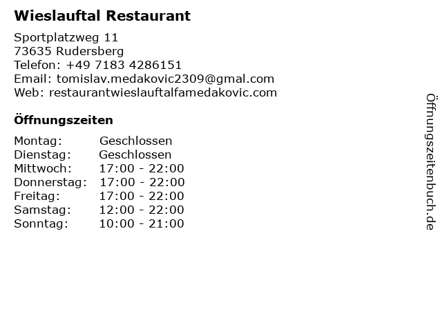 | Öffnungszeiten Wieslauftal Restaurant in Rudersberg anzeigen | |